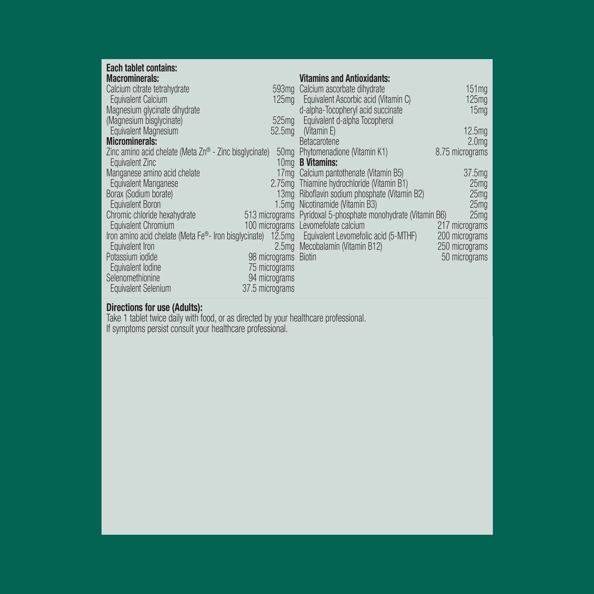 100 microgramsIron amino acid chelate (Meta Fe®- Iron bisglycinate)