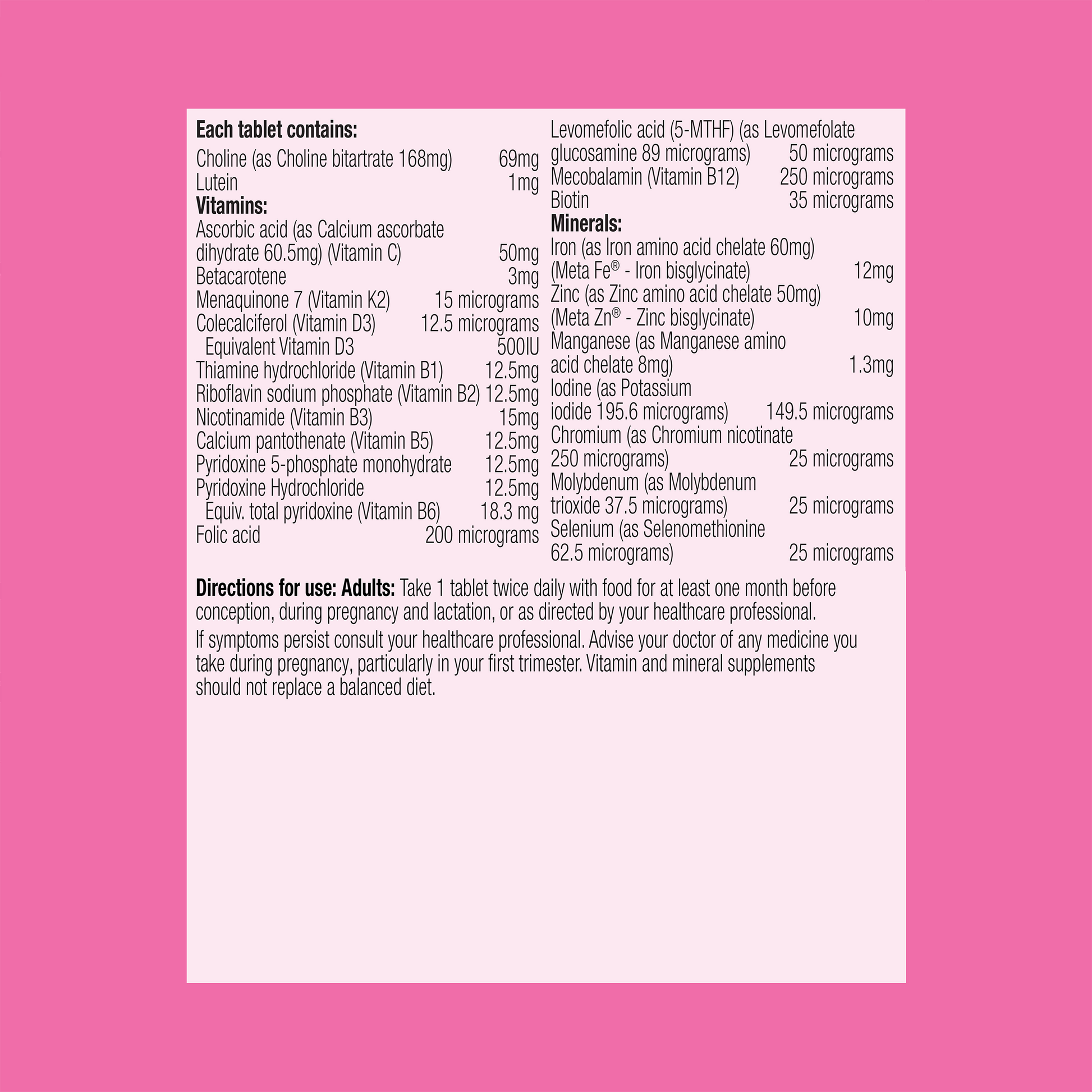 35 microgramsIron (as Iron amino acid chelate 60mg) (Meta Fe® - Iron bisglycinate)